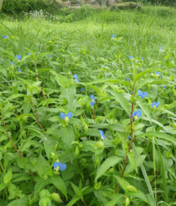 私は3反ほどの畑でいろいろな薬草を育てていますが、除草剤を使わないため、毎年ツユクサが大量に生えてきます。ひたすら生え続けるので、さすがに大量すぎて大半は刈るなどして除草します。