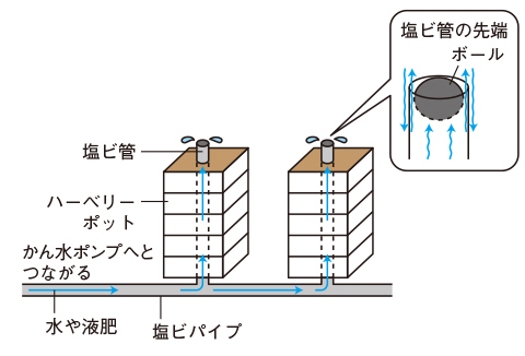 試し読み 野菜・草花 菜園 2026年 4月号 ハーベリーポットでイチゴの立体栽培 2026-03-12 取材対象者:橋渡賢図さん(栃木県足利市) 『現代農業』2026年4月号「ハーベリーポットでイチゴの立体栽培」より 無類のDIY好き イチゴハウスに入ると、中央はふつうの高設ベンチだが、サイド部分はまるで壁面緑化のようにイチゴが植わっている。近づくと、5段重ねになったプランターの各段に1~2株ずつイチゴが植わっていて、見たこともない光景だ。 栃木県足利市にある約0.8aのハウスで「とちあいか」などをつくる橋渡賢図さんは、なんとガーデニング用プランターでイチゴを立体栽培している。橋渡さんが新規就農したのは5年前。植物工場などバイオ関係の研究者だったが、早期退職してイチゴづくりを始めた。 「じつは昔からDIYがすごく好きなんですよ。ハウスも高設ベンチも自分で組み立てました」 ハウスを業者に発注すると高額になるので、中古オークションなどでパイプや部材を安く入手し、間口5.5m×奥行き50mの単棟ハウス3棟を自分で建てることにした。 ハーベリーポットが使える 次に考えたのがハウス内の高設ベンチのレイアウト。ベンチを最大5列入れると2列はサイド際に置かないといけない。そこは1条植えになるので栽培本数が減ってしまう。これではベンチがもったいない。 「定植本数を増やすには立体栽培がいいと思いました。ネット検索したときにたまたま見つかったのが、ハーベリーポットなんです」 ハーベリーポット(Richell)は、三つ葉のような形のガーデニング用プランターで、互い違いに積み重ねると立体栽培ができる。これなら面積当たりの栽培本数を増やせるんじゃないか。さっそく就農前に自宅のベランダで5段積み重ねてイチゴを試作。手ごたえを感じたので、ハウスの両サイドの列をハーベリーポットにした(上図)。ハウス1棟当たりで栽培できる本数は、高設ベンチだけだと1320本、対してハウスサイド2列をハーベリーポットにすれば1950本植えられる。 資材代よりも定植本数 気になるのはコストだ。ハウス3棟分の高設ベンチ(9列分)代は45万~50万円ほどかかった。対してハーベリーポットはハウス3棟、合計6列分と予備(合わせて約2500個)で約80万円。決して高設ベンチより安いわけではないが、「栽培本数を増やせるのは大きいです」と橋渡さん。 ハウス1棟当たりの定植本数の差が630本なので、3棟分だと1890本。ハウスをもう1棟建てる本数に匹敵し、売り上げが100万円ほど変わってくる。同じ面積で売り上げを増やすにはたくさん植えるのが手っ取り早い。だから面積当たりの定植本数にこだわっているのだ。 下段に勢いのある苗を定植 イチゴの植え方にも工夫がある。ハーベリーポットを5段重ねにしているのだが、最上段には苗を植えず、上段の株が下段の光を遮らないようにしている。また、橋渡さんは上段と日照条件がやや悪い下段で生育差が生じないように、生育のいい苗は下段に優先して植えている。 不思議なのは、光がよく当たるハウス中央の高設ベンチと、やや日陰ができるハーベリーポットでイチゴの生育に差がほとんどないことだ。 「ハーベリーポットには園芸用の土を使っています。高設ベンチで使っているヤシ殻ベースの軽い培土より土のほうがイチゴの根にとっていいのかもしれないですね」 少し屈むだけで作業できる 作業面ではどうだろう。高設ベンチの最大の利点は収穫や葉かきなどの作業をしゃがまずにできること。ところが、立体栽培は最上段でも股下くらいの高さにしかならない。 「下段の作業もそんなに苦じゃないですよ。収穫は腰を曲げて屈めばイチゴに手が届きます。葉かきとかの手入れは、疲れたらポットの正面にイスを置いて座ってやっています」 ハーベリーポットは15cmほどかさ上げした台の上にあるので、しゃがんでやるほど大変ではないそうだ。 かん水システムと防除ノズルも自作 もう一つ気になっていたのがかん水方法だが、なんと橋渡さんは塩ビ管でかん水と追肥(液肥)ができるシステムを自分で作ってしまった。 ハーベリーポット5段分の中央を貫くように塩ビ管を立て、下から先端に向かって水が出るように塩ビ管をつないだ(下の図)。先端から漏れ出た水や液肥が上段から下段に移動することで、自動で肥培管理ができる。 さらに橋渡さんは防除ノズルも自作…… この続きは『現代農業』2026年4月号または「ルーラル電子図書館」でご覧ください。 2026年4月号「塩ビ管、コンテナ、土のう袋でも大丈夫」コーナーには、以下記事もあります。・省スペースで日当たりバツグン、猛暑に負けない 小さな庭の塩ビ管栽培 下村京子・不耕起の原野から苗を守る 塩ビ管でゴーヤーのつつっぽ栽培 河野充憲・腰がラク、草取りいらず 絶景! 倉庫の屋上でコンテナ栽培 木原英雄・ミニトマト、茎ブロッコリー、ルッコラ 安上りで土壌病害が出ない土のう袋栽培 佐藤郁哉ぜひ本誌またはルーラル電子図書館でご覧ください。 ルーラル電子図書館は、